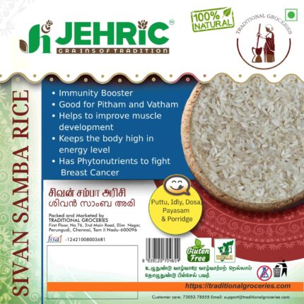 Thanga Samba is a long term crop - white rice used for regular meals. It has special characteristics for the skin issues and low glycemic rice. Benefits: * Helps to strengthens the Heart * Enables to achieve shining and healthy skin * A good tonic for the body and improves digestion * High in total Ash and Protein * Cures tooth problems * Rich in nutrients like Protein, Fiber, Vitamins and Calcium * Low glycemic rice Recipes: Rice, Pulav and Pongal